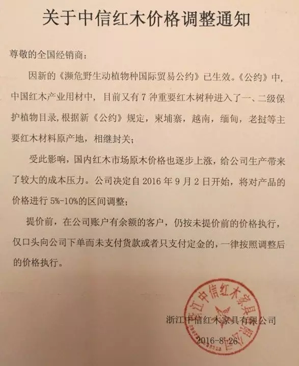 受此影响,国内红木市场原材价格也逐步上涨,给公司生产带来了较大的成本压力。公司决定自2016年9月2日开始,将对产品的价格进行5%—10%的区间调整。