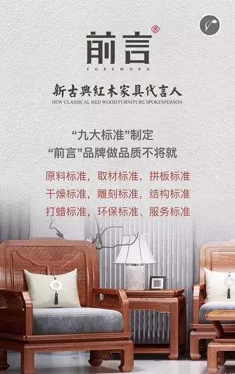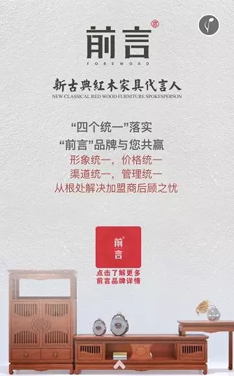 据悉,杭州国际家具展占地120000平米,是华东家具产业走向世界舞台的重要窗口,是推动华东家具品牌知名度的强力助手。“前言”与400余家优秀品牌共同论道,彰显了其浩大的格局及做一流品牌的决心。从市场调研到专卖店招商,“前言”耗时两年。浙江省工艺美术大师、中信红木董事长李忠信亲自考察全国市场,认准新古典红木家具市场,并迅速围绕其建立核心运作团队。可以说“前言”是站在中信红木这位“巨人”的肩膀上,以高瞻远瞩的格局与务实奋进的品质一步步走到中国红木家具行业舞台中央!