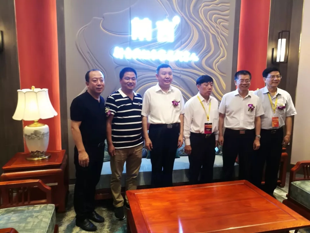 杭州家具展总经理赵艺学(左一)、中信红木董事长李忠信(左二)、中国家具协会理事长徐祥楠(左三)、浙江省家具行业协会理事长倪良正(左四)、中国建筑材料流通协会会长秦占学(左五)、浙江省家具行业协会名誉理事长蒋鸿源(左六)在中信红木“前言”展厅合影