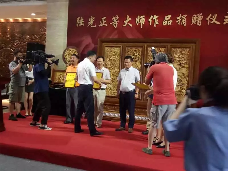 金华市副市长、东阳市市委书记黄敏为浙江省工艺美术大师、浙江中信红木董事长李忠信颁牌