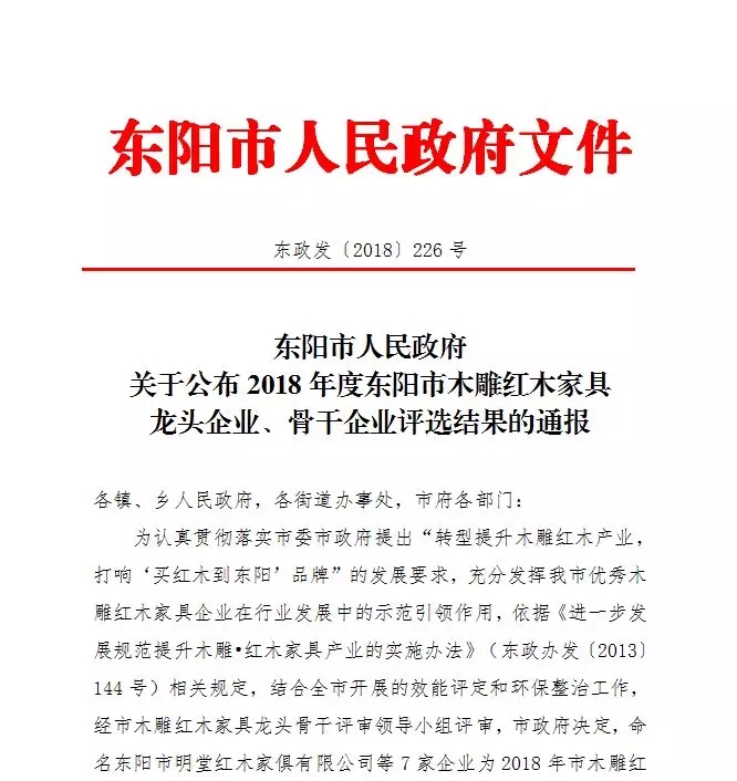 近年来,浙江省东阳市木雕红木家具品牌影响力不断提升,为了认真贯彻落实市委市政府提出的“转型提升木雕红木产业,打响‘买红木到东阳’品牌”发展要求,充分发挥优秀木雕红木家具企业在行业发展中的示范引导作用,浙江省东阳市依据相关标准,评选出2018年度木雕红木家具龙头企业、骨干企业。浙江中信红木家具有限公司(以下简称中信红木)荣获2018年度东阳市木雕红木家具龙头企业。