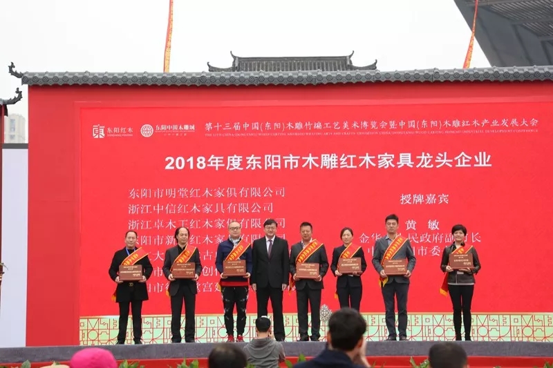 11月15日上午,第十三届中国(东阳)木雕竹编工艺美术博览会(以下简称东博会)暨中国(东阳)木雕红木产业发展大会隆重开幕。开幕式上,东阳市2018年度木雕红木家具龙头骨干企业名单揭晓,并举行了授牌仪式。