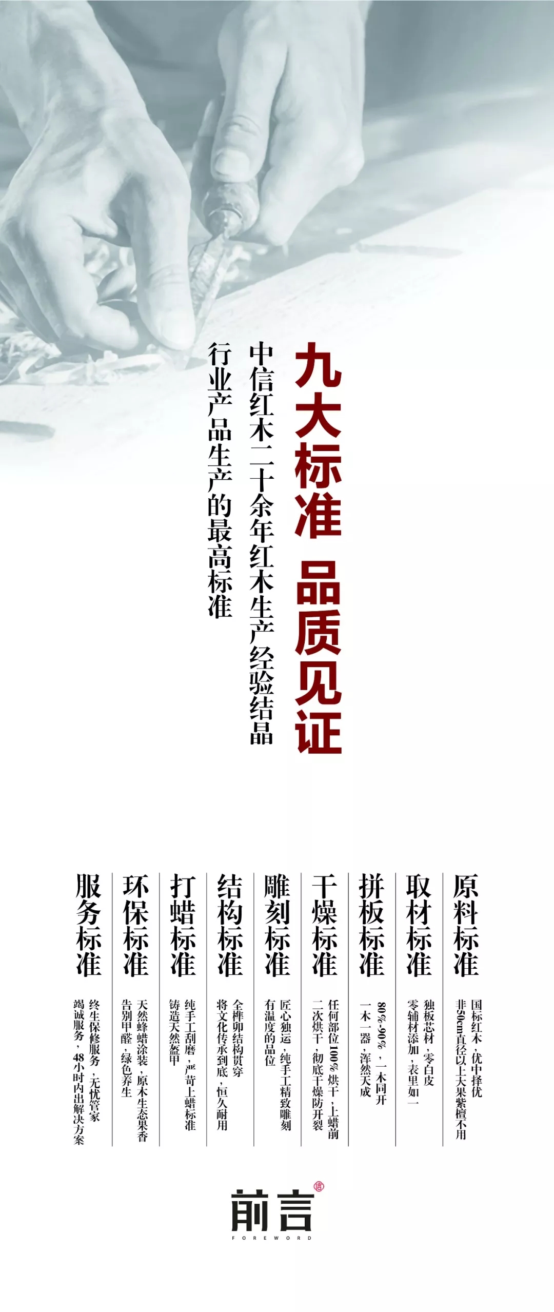 “前言”在对待材料和工艺标准上严格按照“946”模式执行。“946”模式即九大标准、四大统一、六大系列,从产品、渠道、服务三方面打通品牌生命线,让客户放心选择“前言”的产品。九大标准是中信红木二十余年红木生产经验的结晶,也是红木行业产品的最高标准。“前言”品牌以匠心落实在原料、取材、拼板、干燥、雕刻、结构、打蜡、环保、服务这九大环节上的工艺标准,确保产品品质如一;做到四个统一:形象统一、价格统一、渠道统一、管理统一,为加盟商解后顾之忧;提供《花开富贵》、《荷塘月色》、《盛世祥云》、《喜春来》、《合家欢》、《满堂彩》六大产品系列,给客户提供多元化选择。