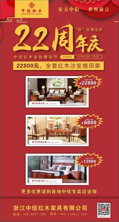 22周年“信”好遇见你,特此推出金秋爆品活动,9月8日-10月8日,全国统一抢购价仅需22800元,全套红木沙发带回家!