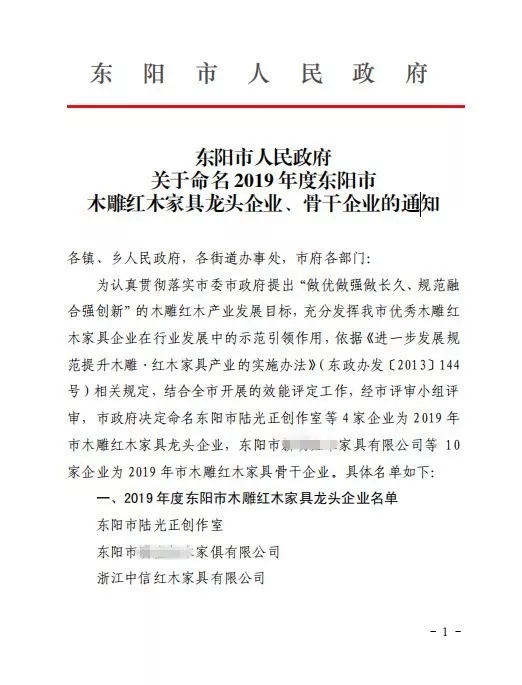 近日,东阳市人民政府正式下达关于命名2019年度东阳市木雕红木家具龙头、骨干企业的通知,中信红木不负众望,再获殊荣!