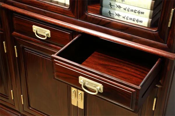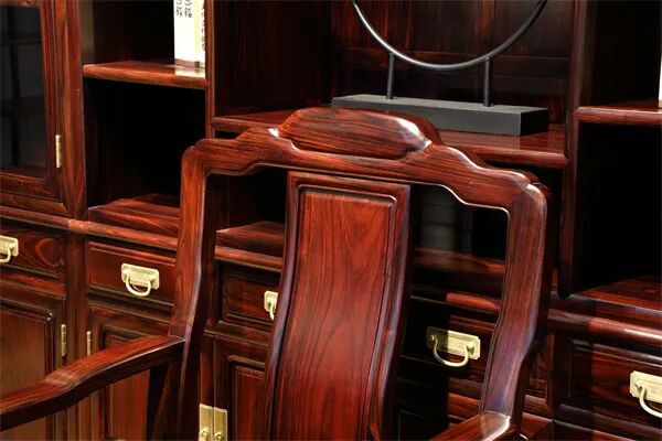 《景程书台》以阔叶黄檀为主材,这种木材质地坚硬,纹理细腻,色泽深沉,是制作高档红木家具的上佳之选。