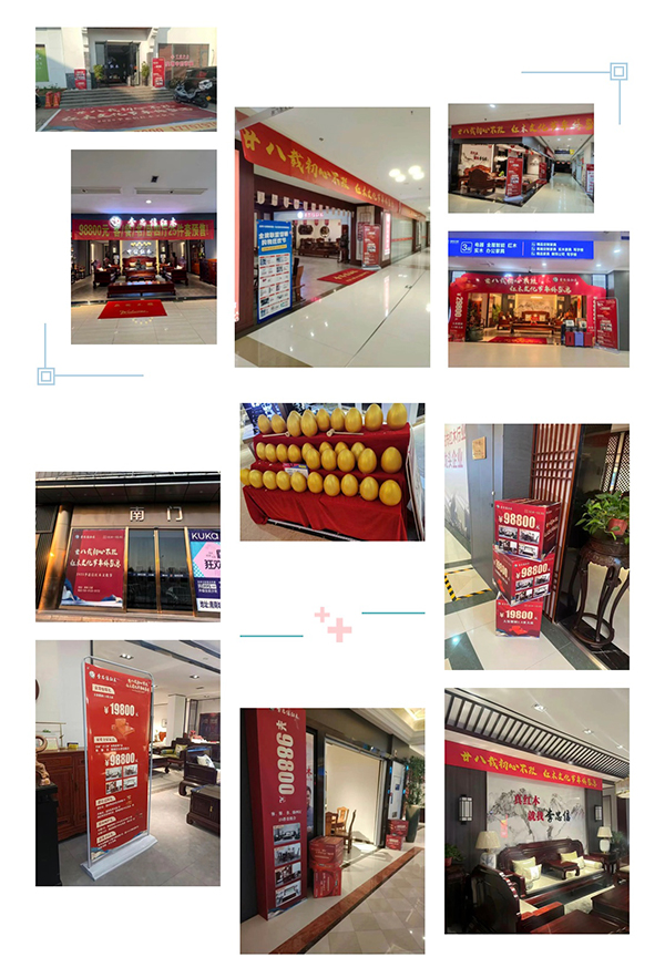号角吹响,全国响应。在启动会后短短数日内,遍布大江南北的三百余家李忠信红木专卖店快速完成“变装”。统一的主题海报、道旗、地贴、礼品堆头将门店装点得喜庆而典雅。